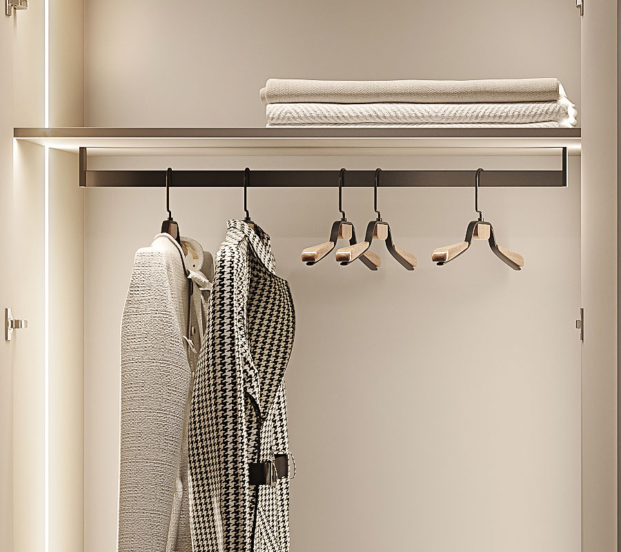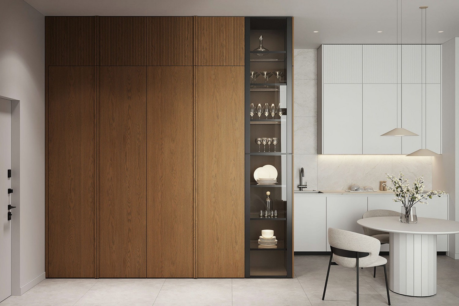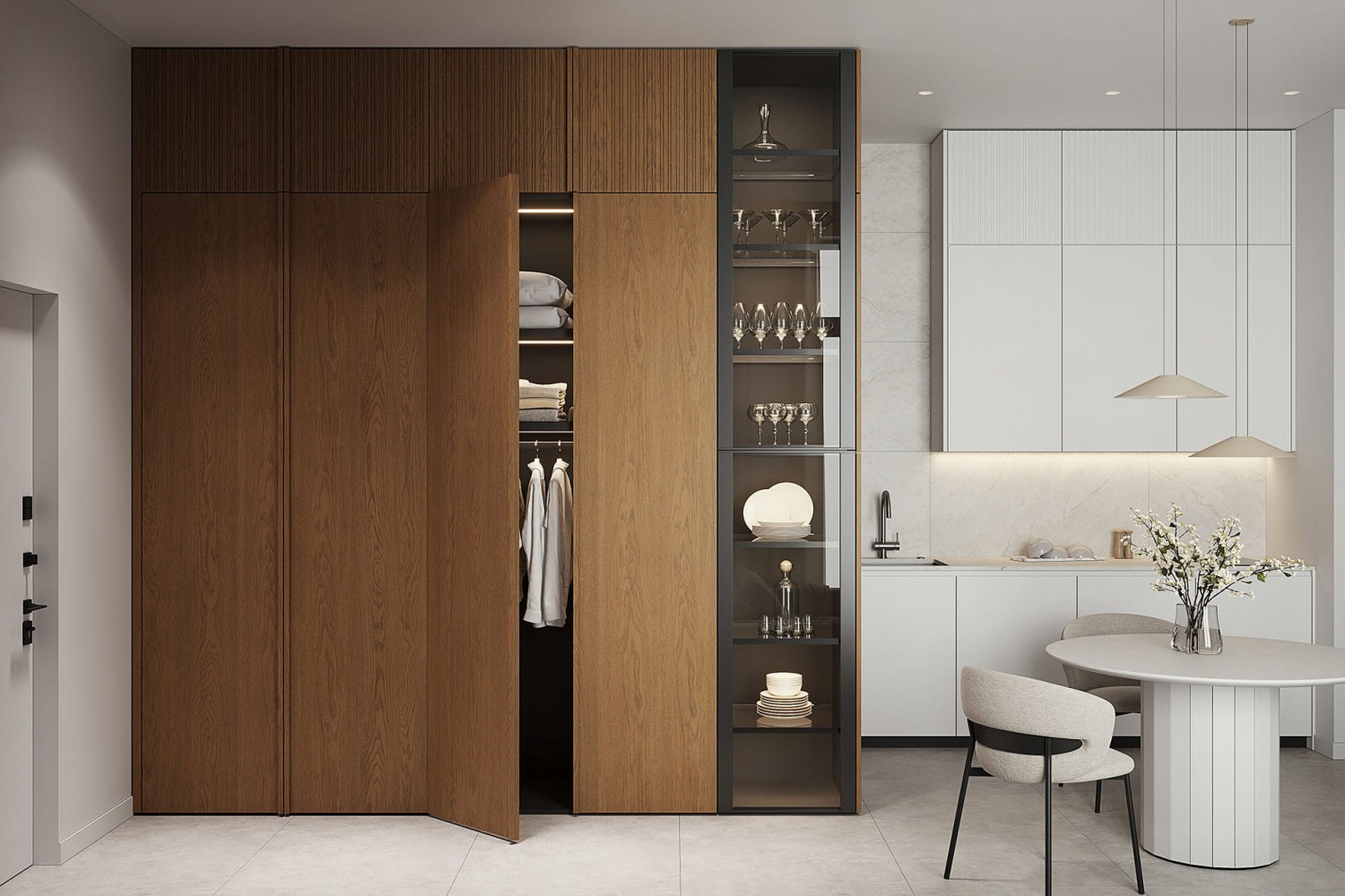 Современный гардероб, совмещённый с кухней Котра. Лаконичный дизайн этого гардероба оживляется рисунком текстуры дубового шпона, которым облицованы его двери.