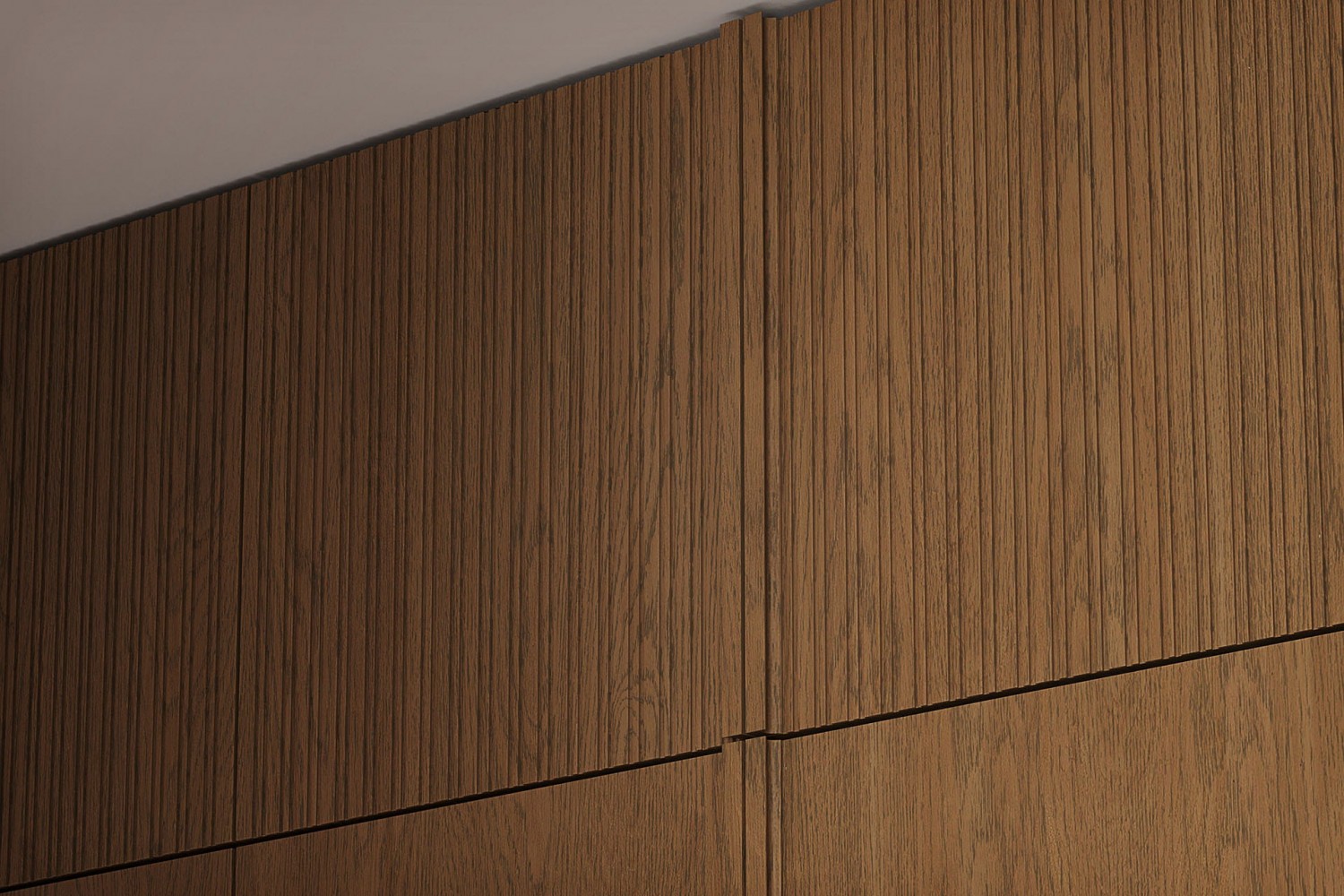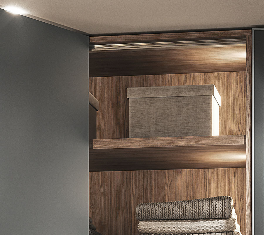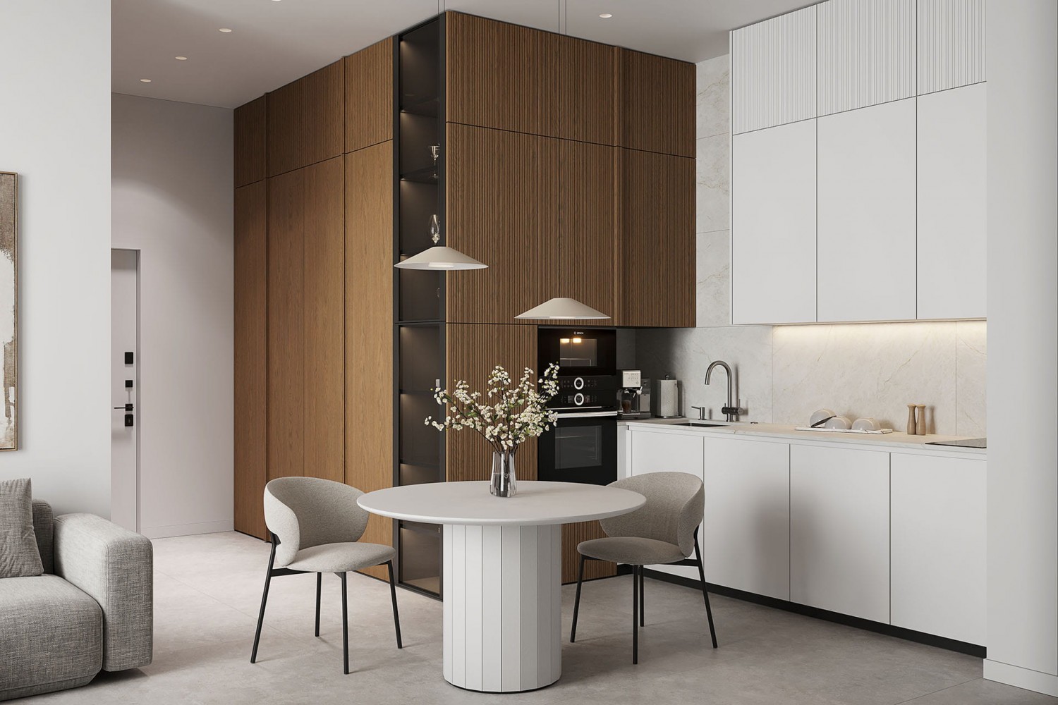 Современный гардероб, совмещённый с кухней Котра. Лаконичный дизайн этого гардероба оживляется рисунком текстуры дубового шпона, которым облицованы его двери.